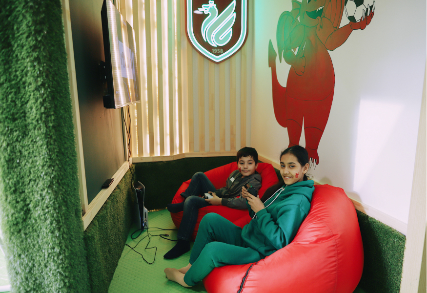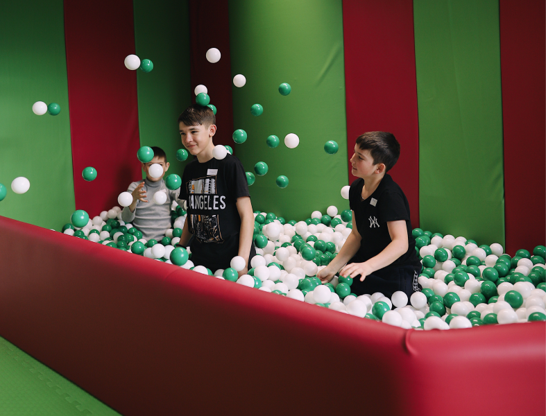 Игровое пространство, выполненное в стилистике «Рубина», в будущем планируется оснастить игровым лабиринтом с горками и сухим бассейном, развивающими зонами для поделок и мастер-классов, зоной отдыха с телевизором, приставкой и мягкими пуфами, небольшим футбольным полем, а также кикер-футболом.