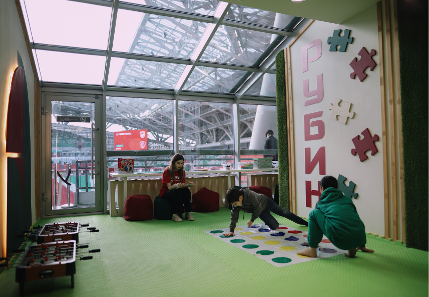 С 2024 года на домашних матчах «Рубина» открыты детские комнаты. Это специально оборудованные комнаты, где дети болельщиков бесплатно могут играть и развиваться под присмотром детских аниматоров, пока их родители будут заняты просмотром матча. Если ваш ребенок – истинный ценитель футбола, то он сможет вживую посмотреть игру, не покидая детскую комнату, благодаря выходу на трибуны. Комнаты работают на Западе (4 этаж, ложа №16) и Востоке (4 этаж, ложи № 32 и 33).